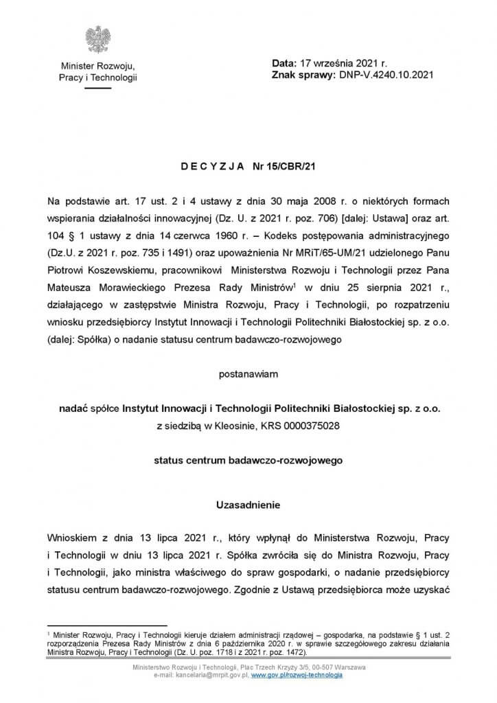 W dniu 20.09.2021 na konto pocztowe Instytutu, wpłynęła decyzja Ministerstwa Rozwoju i Technologii, w której przyznano Instytutowi Innowacji i Technologii Politechniki Białostockiej status centrum badawczo-rozwojowego!