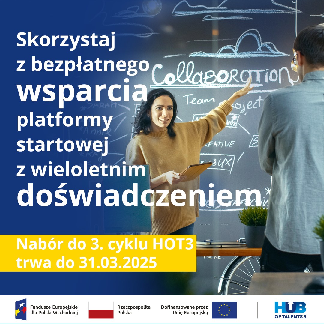 Do 31 marca trwa nabór do 3. cyklu inkubacji Hub of Talents 3. HoT3 jest platformą startową, gdzie każdy, kto marzy o własnym biznesie, może uzyskać zarówno profesjonalne wsparcie ekspertów, jak i realne szanse na dofinansowanie swojego pomysłu.